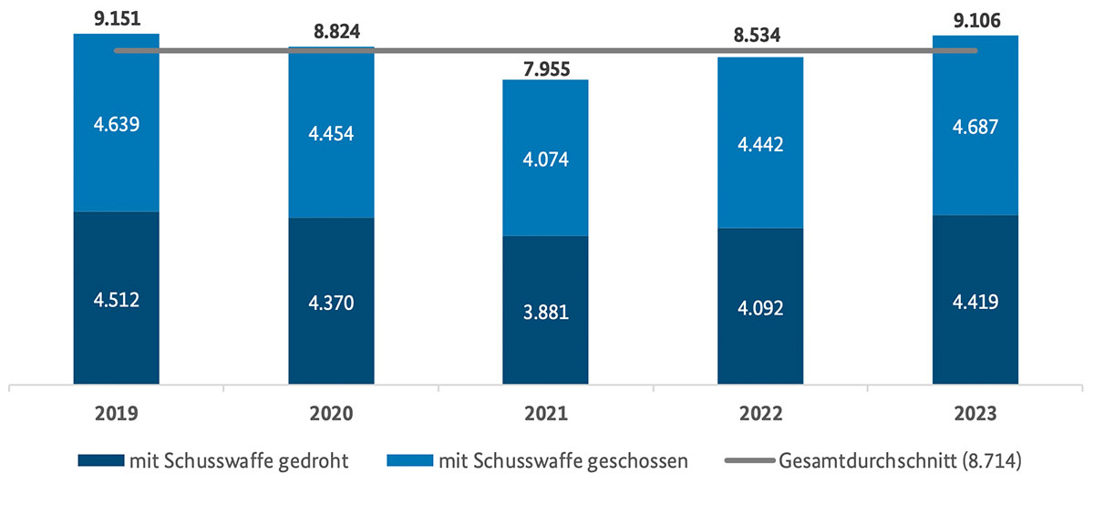 Fallentwicklung bei Straftaten unter Verwendung von Schusswaffen (2019–2023)